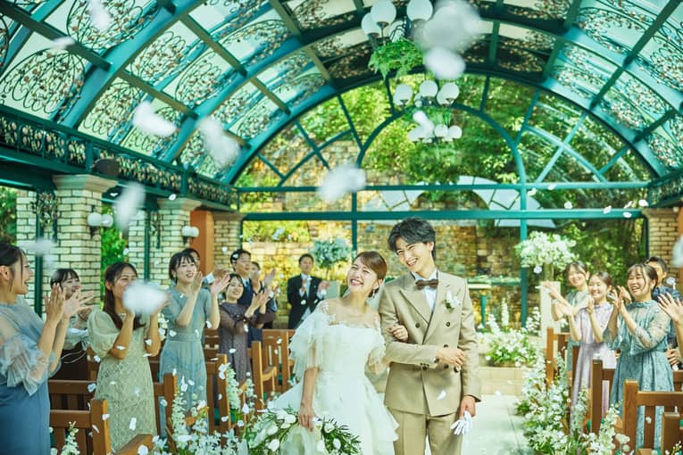 水上のチャペル「アクア・ペルオー・チャペル」での挙式と、モダンな別荘をイメージしたホールでのパーティー。