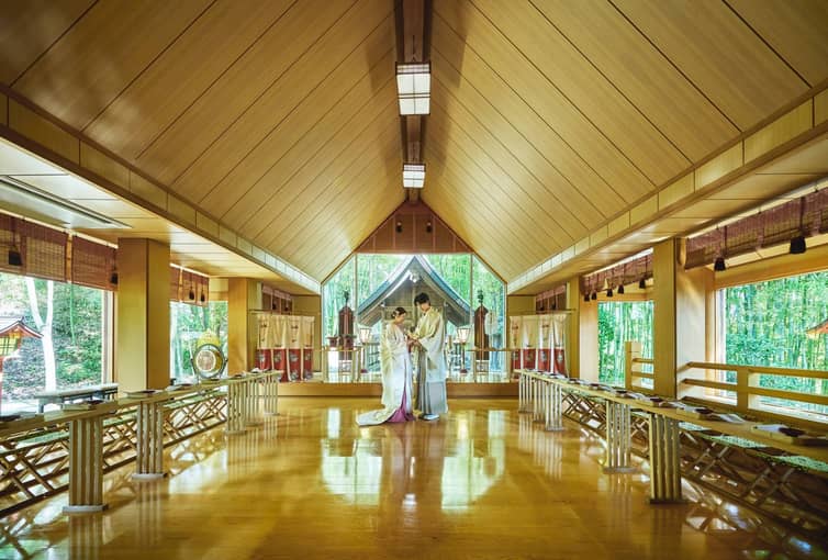 緑の中に佇む、美しく厳かな独立型神殿。出雲大社の分殿として、日本の美しい儀式を執り行っていただけます。